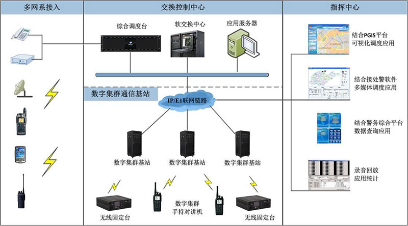 系统可接入模拟集群、常规转信和Tetra集群通信等不同通信网络,实现综合通信调度指挥。