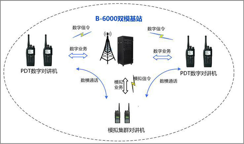 同时提供PDT和MPT控制信令,业务信道工作模式按需动态切换,便于PDT对讲机和MPT对讲机在双模基站内相互通信,确保原有对讲机在PDT数字系统继续使用,保护原有投资。