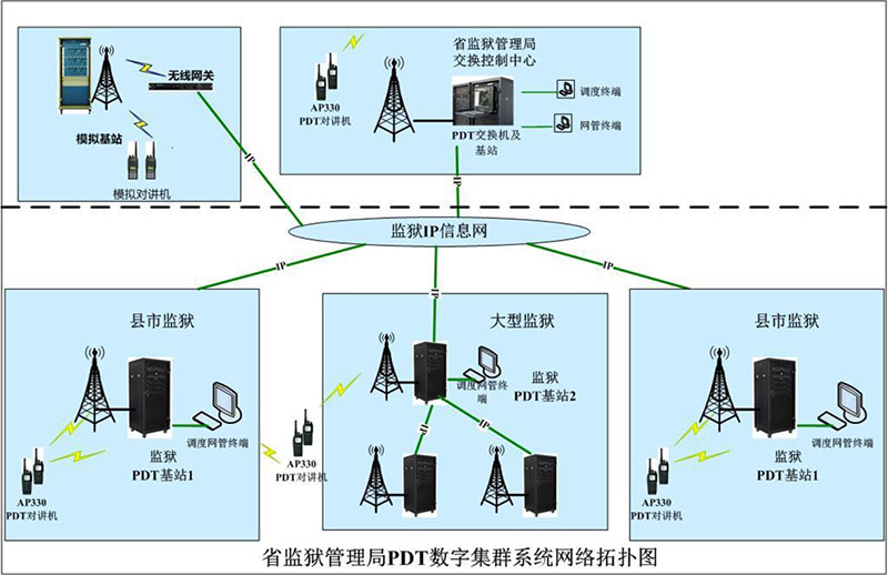 根据监狱部门的行政管理模式和逐级指挥模式,以省监狱管理局为中心,建设二级PDT交换机的配置,采用分层管理和权限设置,形成省、市、县三级网络管理结构。通过集中管理与分散管理相结合,既能实现全网统一管理、统一监控和统一调度,也能按区域实现属地化分级管理、监控和调度,方便进行统一和分级的管理、维护和调度指挥。