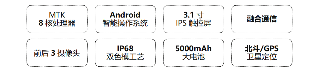 产品采用安卓操作系统,高性能8核处理器,装配3.1寸触控屏,前后三摄像头,机身正面、侧面双录像按键,具备运行流畅,安全稳定,操作快捷的功能优势。