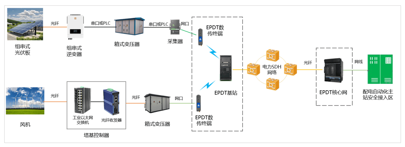 本方案基于EPDT电力无线专网,为风光储场站构建全站覆盖、统一接入的无线通信网络,实现从风机、变流器、光伏逆变器等关键设施的泛在接入。EPDT网络可靠承载运行数据采集、状态监测、功率控制、调度指令等多类业务,通过安全加密通道统一回传至配电自动化主站,从而打通场站内“源-网-荷-储”各环节的数据流与控制流,支撑场站智能化、集约化运营。